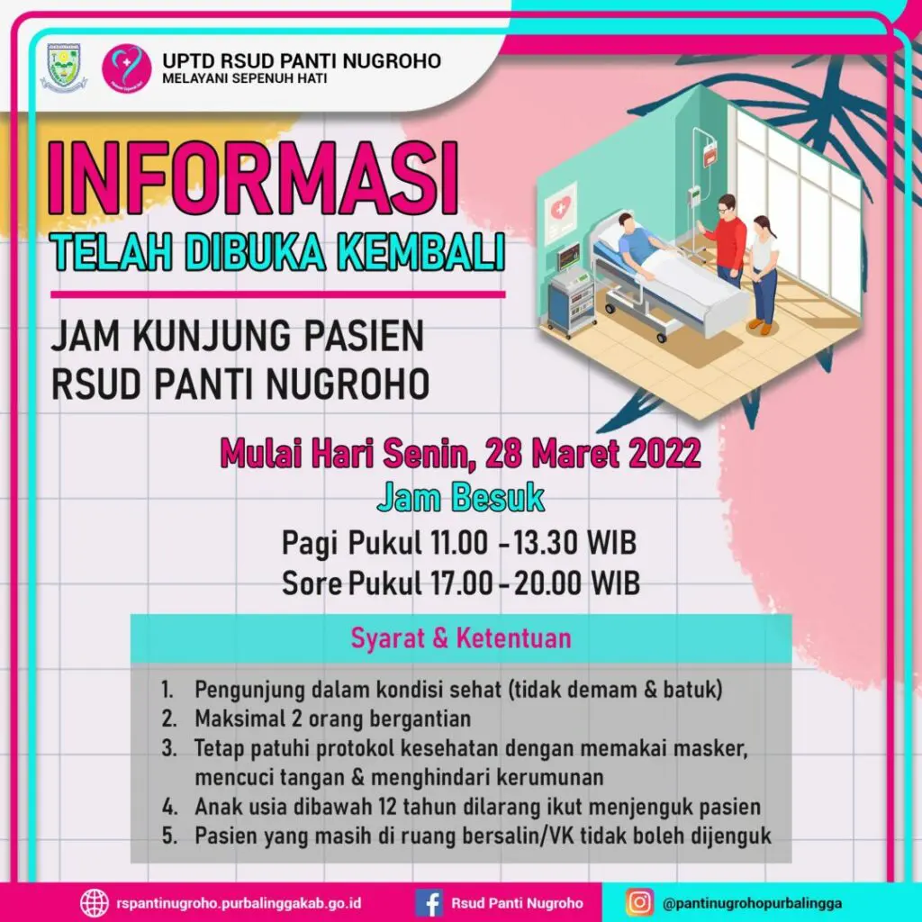 Jam Kunjung Pasien Jam Berkunjung Pasien Setiap Hari Pagi : Pukul 11.00 – 13.30 Sore : Pukul 17.00 – 20.00 PASTIKAN MENGIKUTI SYARAT & KETENTUAN YANG BERLAKU
